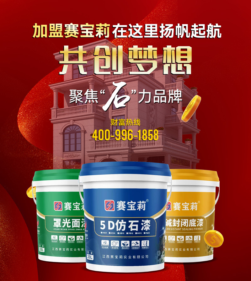 江西賽寶莉?qū)崢I(yè)有限公司總部坐落于英雄城南昌,是一家集建筑涂料研發(fā)、生產(chǎn)、銷售、服務于一體的大型綜合性企業(yè)。專注涂料行業(yè)20余年,是專業(yè)的仿石涂料和藝術(shù)涂料制造商和供應商,擁有獨立研發(fā)實驗室,是CCTV央視廣告播出品牌、“國家高新技術(shù)企業(yè)”“中國建筑材料流通協(xié)會理事單位”。選擇賽寶莉,讓家更美麗。